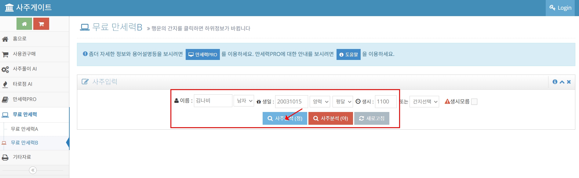 1) 내 아이의 생년월일을 입력하고, 사주분석을 클릭합니다. 일주를 확인하는데 생시는 중요하지 않습니다(실제 사주분석에서는 매우 중요하지만...)