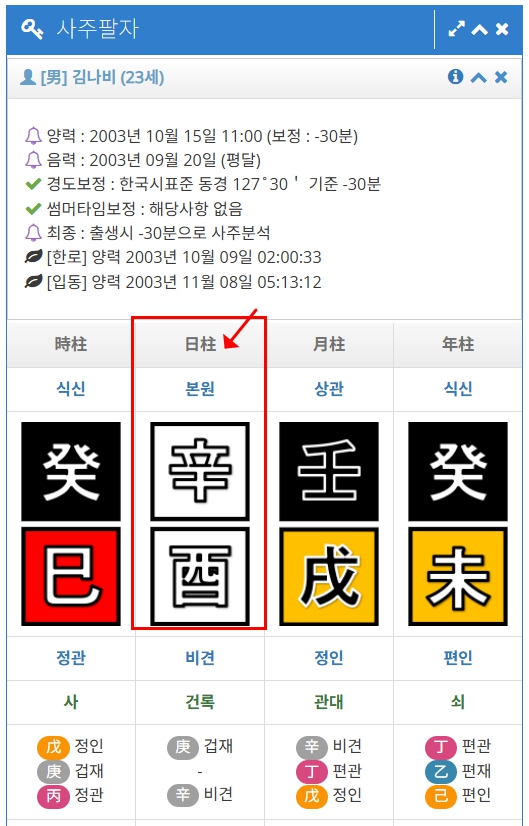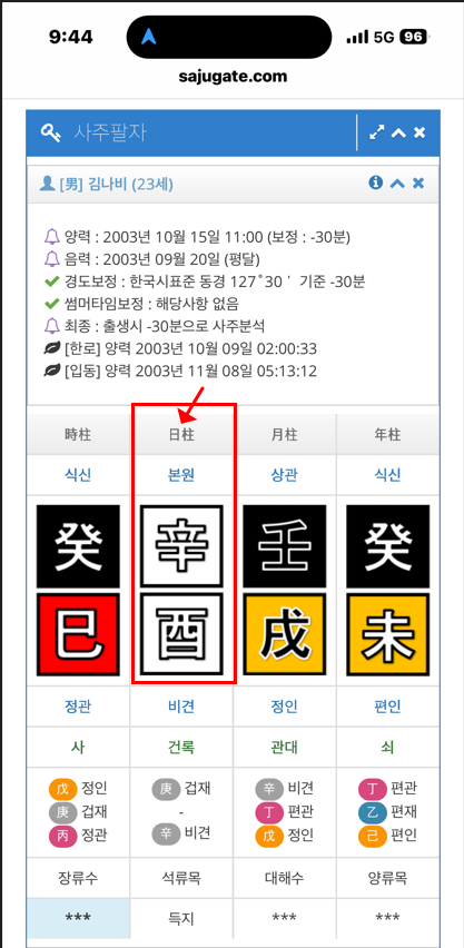 - ② 결과에서 ‘일주’ 찾기: 사주 팔자 표에서 일주가 어디에 표시되는지 캡처로 정확히 짚어드립니다.
